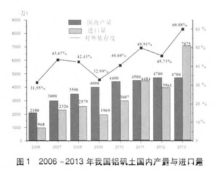 我國鋁礬土資源后備儲量不足,資源保障程度較低,已遠(yuǎn)不能滿足市場需求。鋁礬土的供給矛盾導(dǎo)致我國每年需要大量進(jìn)口國外資源。近幾年中國都是世界上鋁礬土第一大進(jìn)口國,主要的進(jìn)口來源為印度尼西亞、澳大利亞、印度等國家2006年-2013年我國鋁礬土國內(nèi)產(chǎn)量和進(jìn)口數(shù)據(jù)見圖1。可以看出,國內(nèi)鋁礬土的開采量和進(jìn)口量呈逐年遞增的趨勢,鋁礬土的對外依存度已超過50%,而2013年我國鋁礬土進(jìn)口量大大增加是由于受印尼政府出臺政策限制鋁礬土原礦出口的影響而提前大量備貨,自2014年一月12日起印尼禁止未經(jīng)加工的原礦出口,我國鋁礬土的進(jìn)口來源受到較大的影響,2014年我國鋁礬土進(jìn)口量為3 653萬余t,國內(nèi)部分氧化鋁廠鋁礬土供應(yīng)捉襟見肘,中國鋁礬土供應(yīng)形式變得更加嚴(yán)峻。