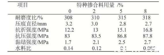 最終配方為525水泥34.5%, 特種摻合料5%, 石榴石砂60%, 減水劑0.1%, 消泡劑0.04%, 纖維素醚0.06%, 氟硅酸鋅0.2%, 十二烷基苯磺酸0.1%。金剛砂地坪配方調(diào)整后的性能為耐磨度比330, 比空白配方提升了7.1%, 壓痕直徑2.5, 降低了21.9% (性能提升, 壓痕直徑越小越好) , 抗折強(qiáng)度16.2MPa, 提升了32.8%, 抗壓強(qiáng)度87.5MPa, 提升了5.4%, 黏結(jié)強(qiáng)度3.1MPa, 提升了82.4%。
